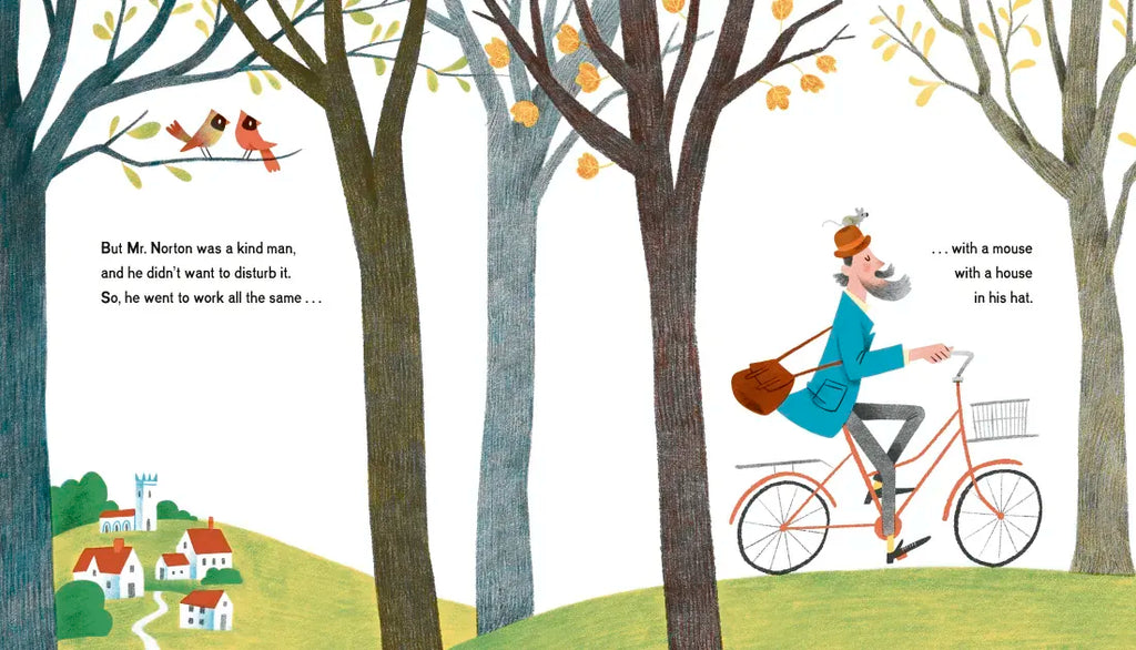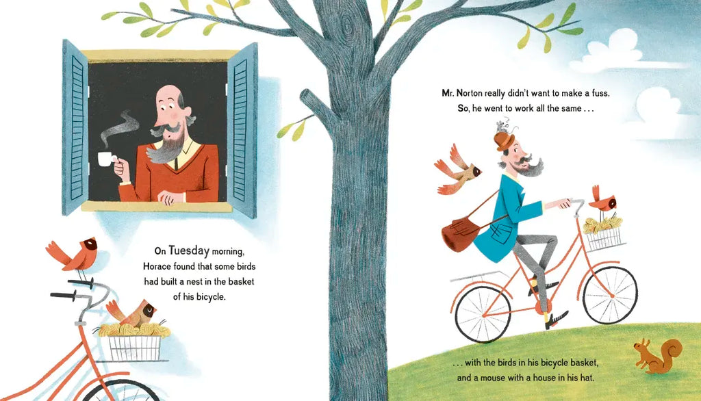 One Monday morning, Horace Norton finds that a mouse has made a house in his hat. Now, this is something of a surprise . . .and it’s only the start of a wild week for the kind and calm Mister Norton, who, with each passing day, discovers more and more animals have moved in with him. From birds in his bicycle basket to squirrels in his shoes, not to mention the collection of cats curled up in his coat!