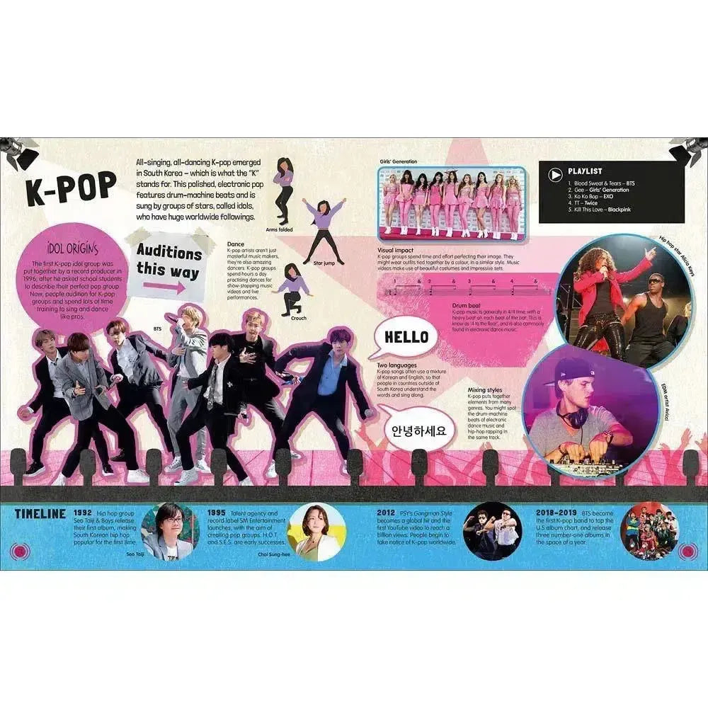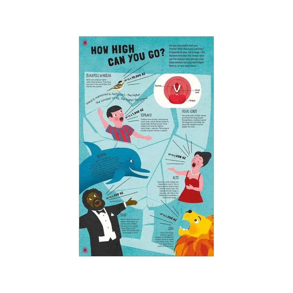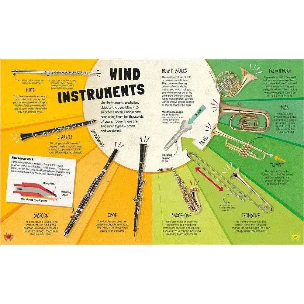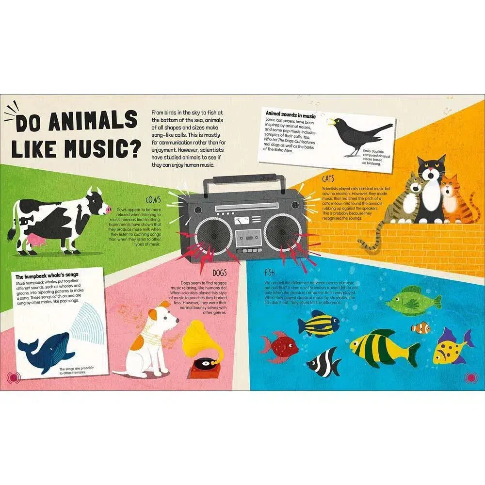 The book looks at music throughout history, beginning with the first known melody from the Fertile Crescent and covering modern music phenomena, from K Pop to hip-hop. Instruments and genres from across the world are featured, with "playlists" of key pieces encouraging kids to look up pieces to hear for themselves. STEAM spreads delve into the psychology and math behind music, from how it affects our mood to how it can improve our minds.