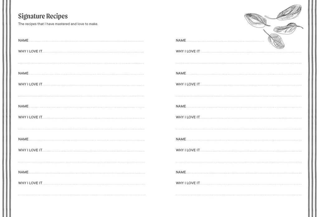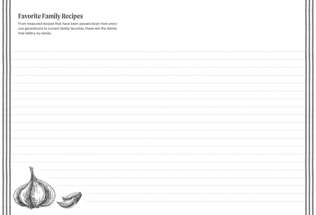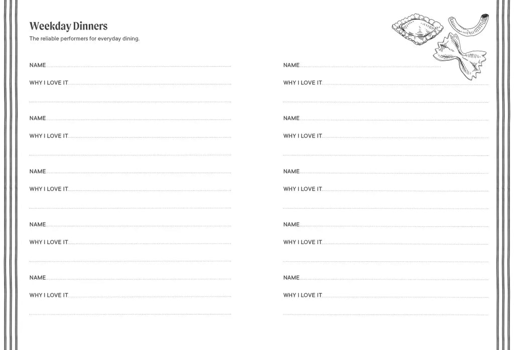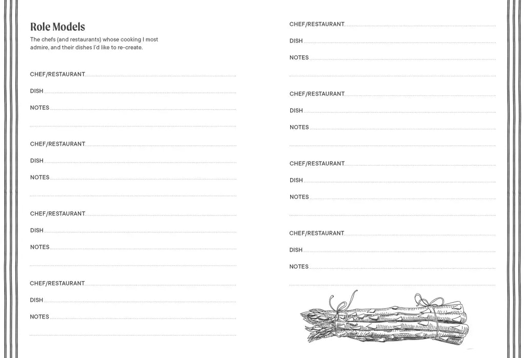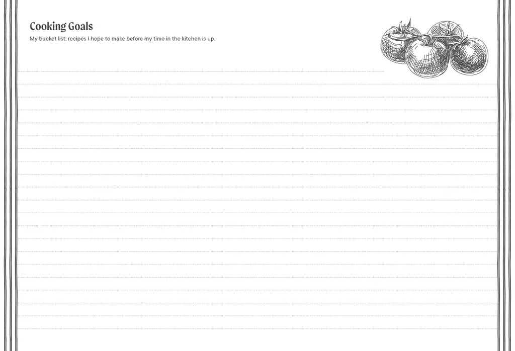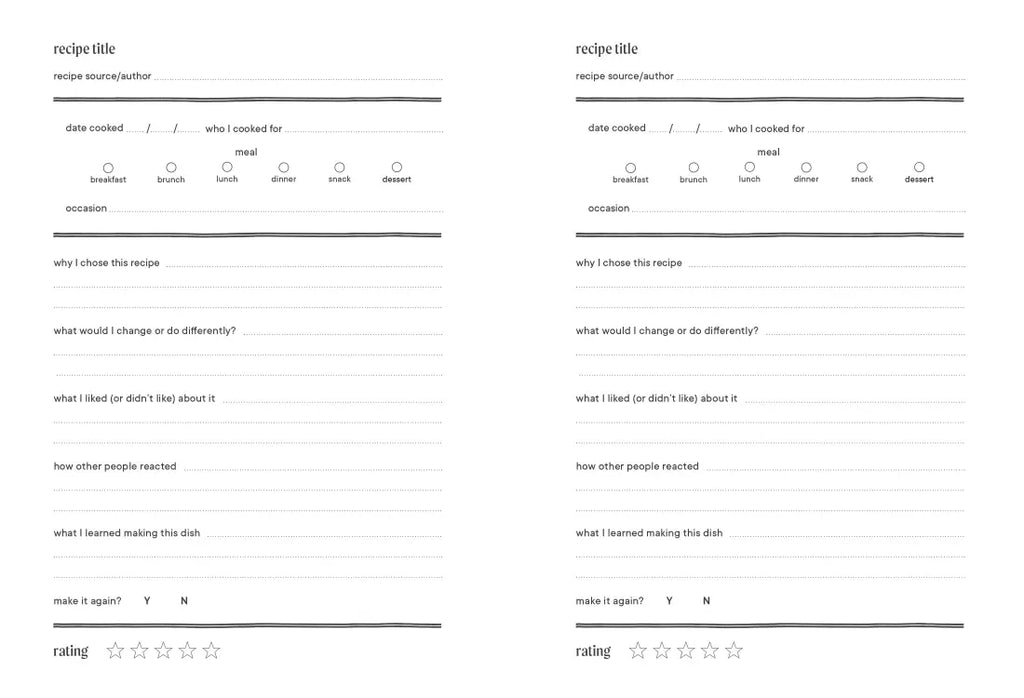 With thoughtful prompts that celebrate all the creativity and work that goes into the art of creating great meals, the result is not only a keepsake that will help inform your future cooking decisions and make you a better cook but a personal memento that you’ll love to look back through.