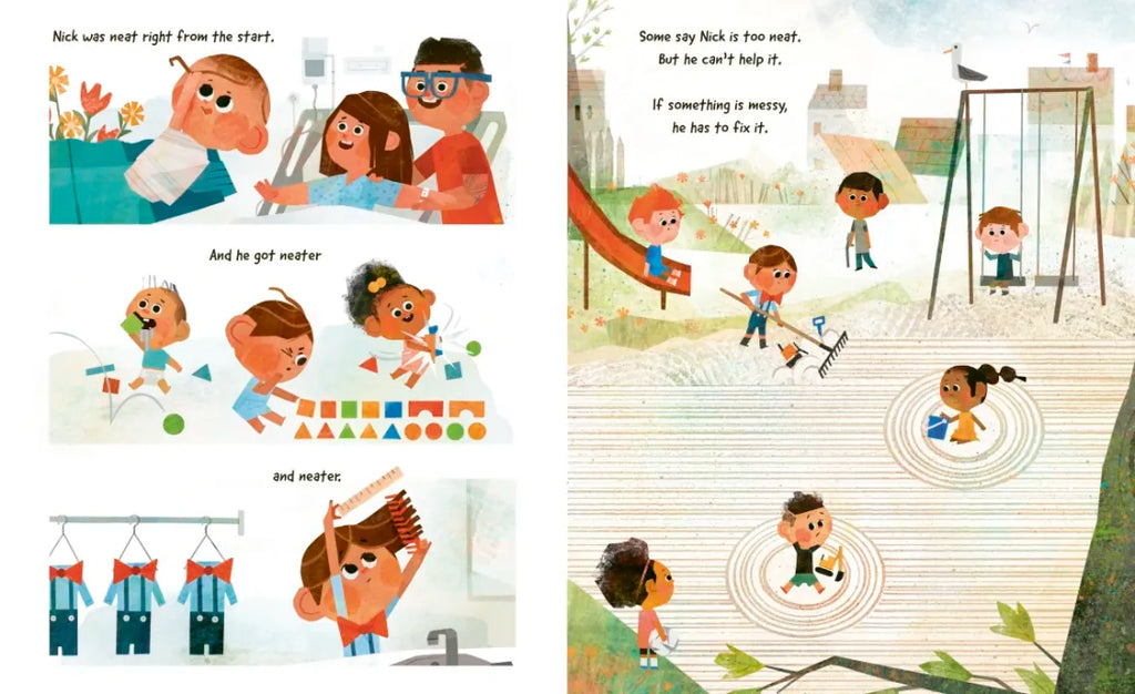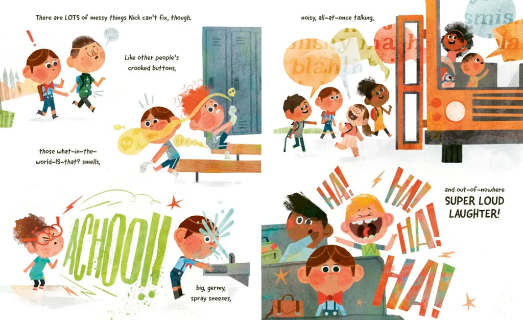 Nick has always been neat. That’s what makes him comfortable. Any kind of mess or noise or other havoc makes him anxious, and often that means he chooses to be alone in his own carefully controlled bedroom. But suddenly a big, drooly, energetic dog has joined the family, and as much as he tries there’s nothing Nick can do to control the doggy mess. And so, he decides he would rather avoid the pup altogether. Or would he?