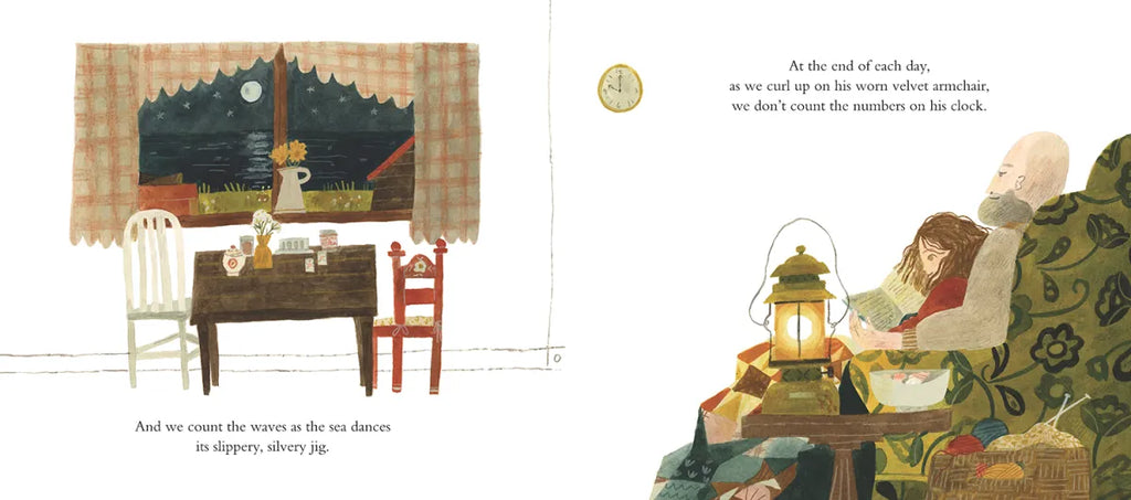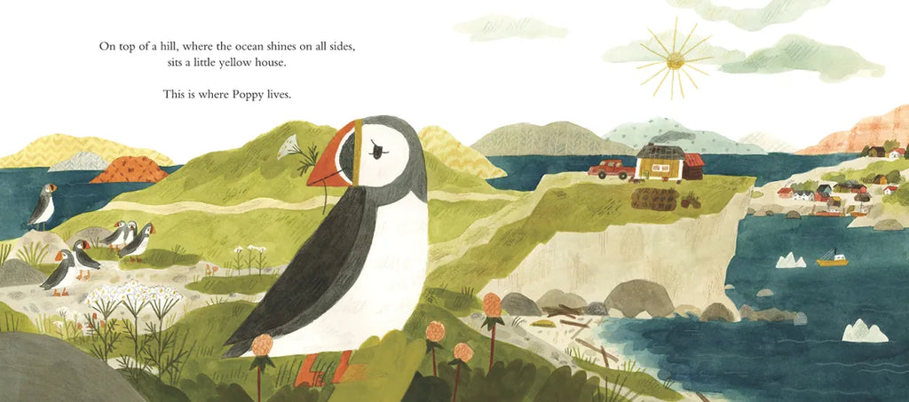 In a picture book as cozy as wool socks and as sweeping as a lighthouse beam, a little girl takes a ferry to an island to spend time with her Poppy. After fresh-baked bread for breakfast, the two tidy up, garden, and set out to explore together. They pass docks and green hills specked with puffins, counting their favorite things along the way: masts, animal tracks, silvery waves. At the end of each day, they snuggle on Poppy’s worn velvet armchair to read by lantern light. When it’s time to travel home, the little girl begins counting the days until she and Poppy will be together again. A patchwork of exquisitely patterned and textured art evokes a traditional quilt in this ode to coastal Canada and to the days spent with an attentive, caring older person.