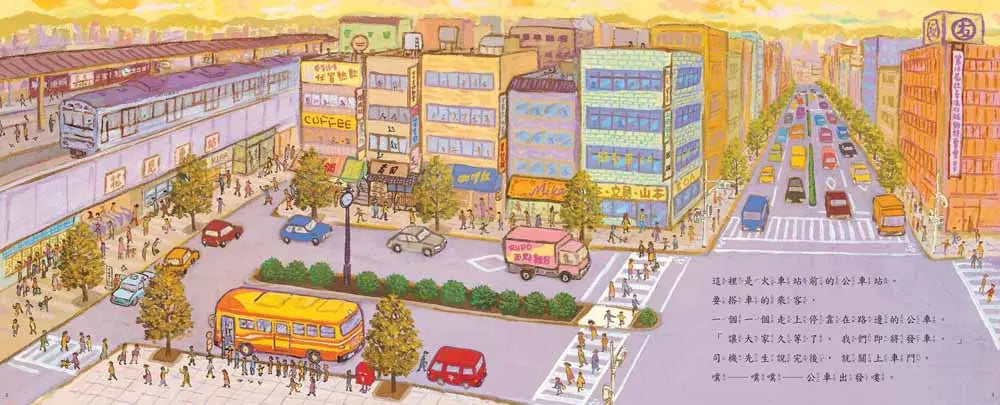 一翻開書,讀者的眼睛隨即跟著公車穿越城市和鄉村,開始進行一趟溫馨的公車之旅。