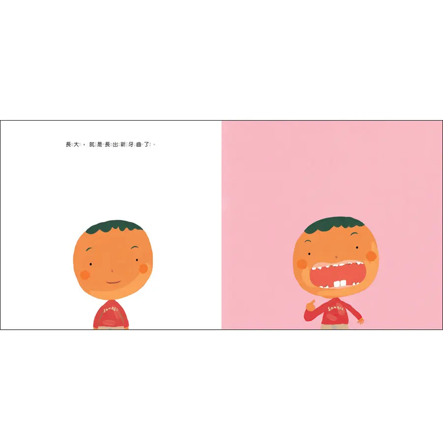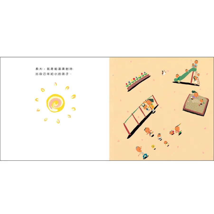 本書從孩子的視角看「長大」,可能是長出新牙齒了、可能是不怕水了、可能是爬得更高了……當我們和孩子一起分享此書的時候,可以共同討論,在彼此的心中,長大是什麼呢?也可以和孩子談談,孩子沒有提到的那些部分,可能是責任感、禮貌、勇氣…等。