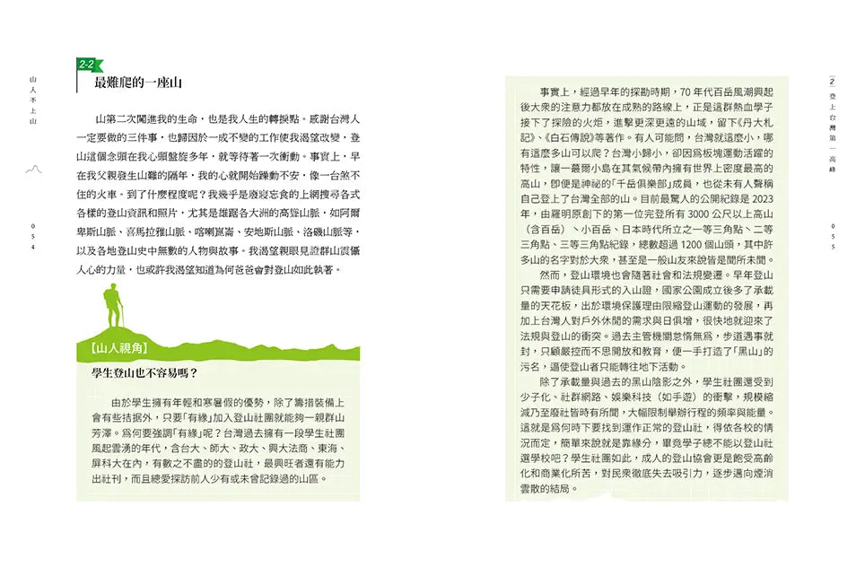 ◆台灣有不少登山相關的書籍,但主要集中在來自西方的登山技能工具書、登山與步道文學等,台灣本土亦有人書寫來自8,000公尺巨峰的攀登故事、步道與路線介紹、抒情與紀實夾雜的登山報導╱紀錄、山林工作者的職業經歷、山林主題的散文集與小說、區域性的環境史專書等。但是著眼台灣整體登山環境,以及作為一位台灣公民該如何看待自家山林的書籍卻極為稀罕。