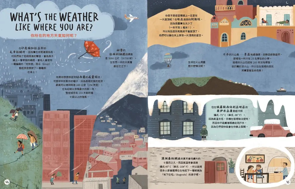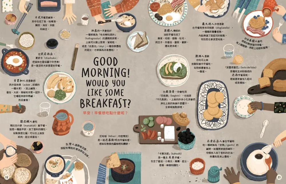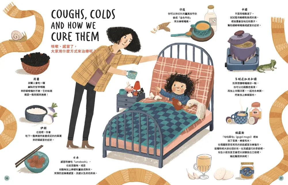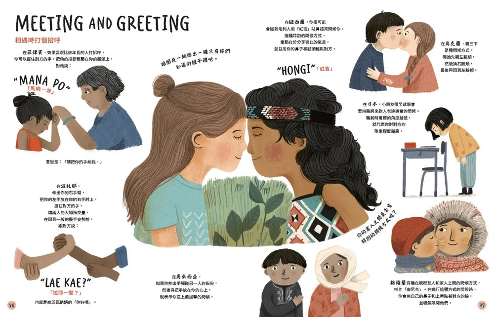 在本書中,你可以看到更多不同的生活樣貌,以小朋友的視角呈現在整部作品中。美妙的畫風點亮引人入勝的新鮮主題,身在台灣的小朋友們也可以藉此看見不同風貌的食衣住行育樂,感受全世界多元文化的智慧與魅力。