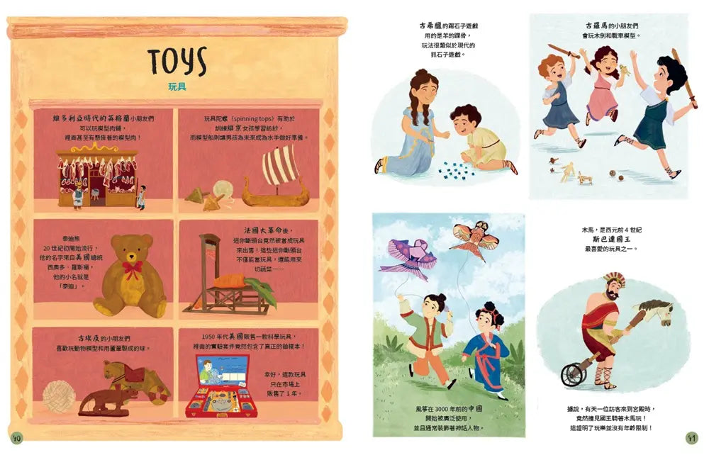 你是否想過維京人或古埃及小朋友的日常生活是什麼樣的?這本書走遍了世界各地,探討歷史上從早餐到睡前的一切。瞭解由兒童發明的尼加拉瓜手語,並認識許多國家的幼兒國王和王后們,以及各種透過小朋友的雙眼所以看到的歷史故事!這是一本探索無止盡的知識繪本,打開孩子對於世界文化與同儕的好奇心。