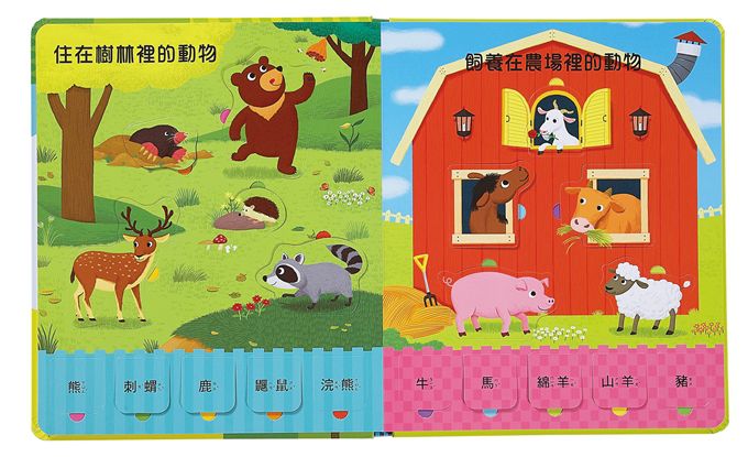 按照動物們的棲息環境做分類,包含草原、森林、農場、海洋、天空等,讓孩子在認識動物的外觀與名稱同時,也認識牠們的生活環境。