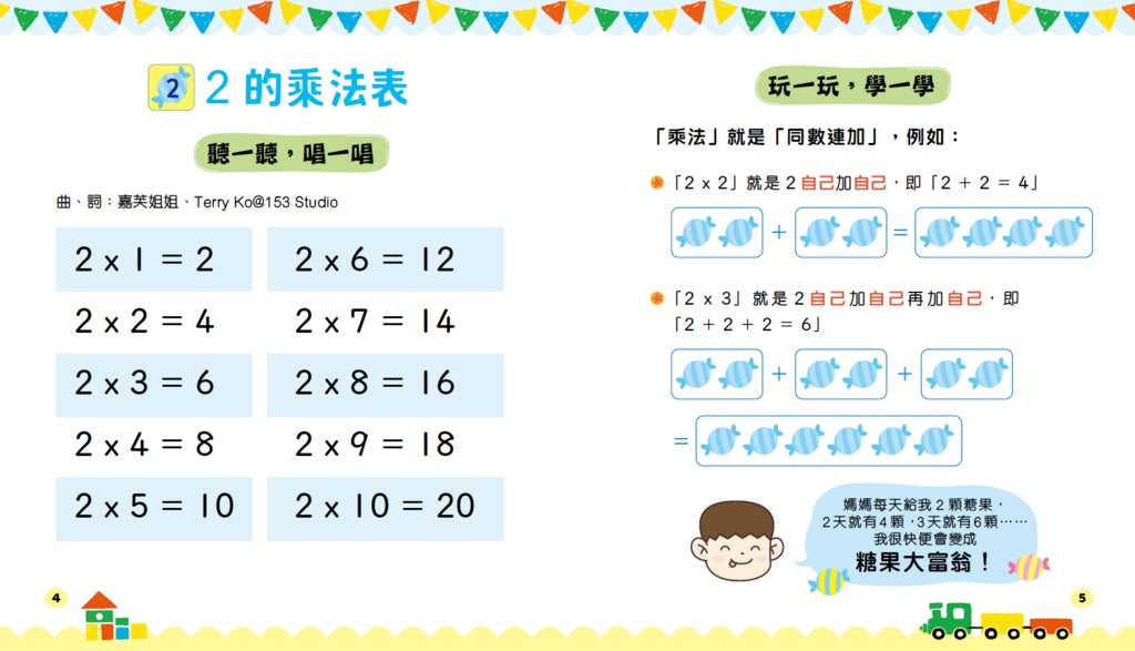 以「同數連加」、「每數個一數」、「單雙數」、「百數表」等方式,深入淺出地介紹乘法的概念。