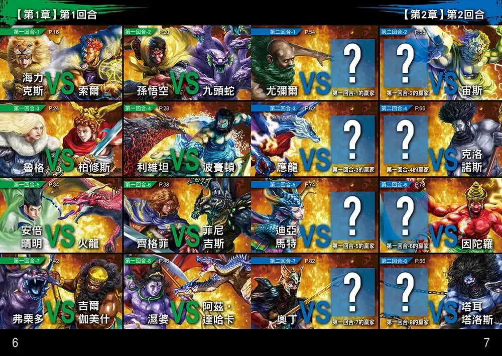 海克力斯VS索爾;孫悟空VS九頭蛇;魯格VS柏修斯;利維坦VS波賽頓;安倍晴明VS火龍;齊格菲VS菲尼吉斯;弗栗多VS吉爾伽美什;濕婆VS阿茲‧達哈卡……