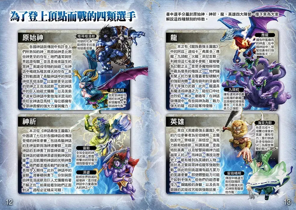 之前,曾經舉辦過「神話最強王」、「英雄最強王」、「龍族最強王」等王者選拔淘汰賽,而參賽的選手們,除了具備極佳的戰鬥能力,有些還能使用魔法或特殊武器,讓每場比賽都精采萬分、毫無冷場,所有人都看得目不轉睛。雖然比賽結束了,但仍止不住人們的好奇心,想著:「如果讓神、英雄、龍決鬥的話,誰會是最強的呢?」這個問題不論怎麼想都不會有答案,還是要比了才知道。因此,我們再次邀請了二十四位強者,舉辦盛大的對戰淘汰賽,而且,這次還有未曾參賽過的「原始神」加入,祂們可是比宙斯等天神更古老的存在,想必會有更厲害的戰鬥招式出現吧?在這場世紀決戰中,究竟誰會取得最後勝利,完全無法預測,只能在書中一探究竟!