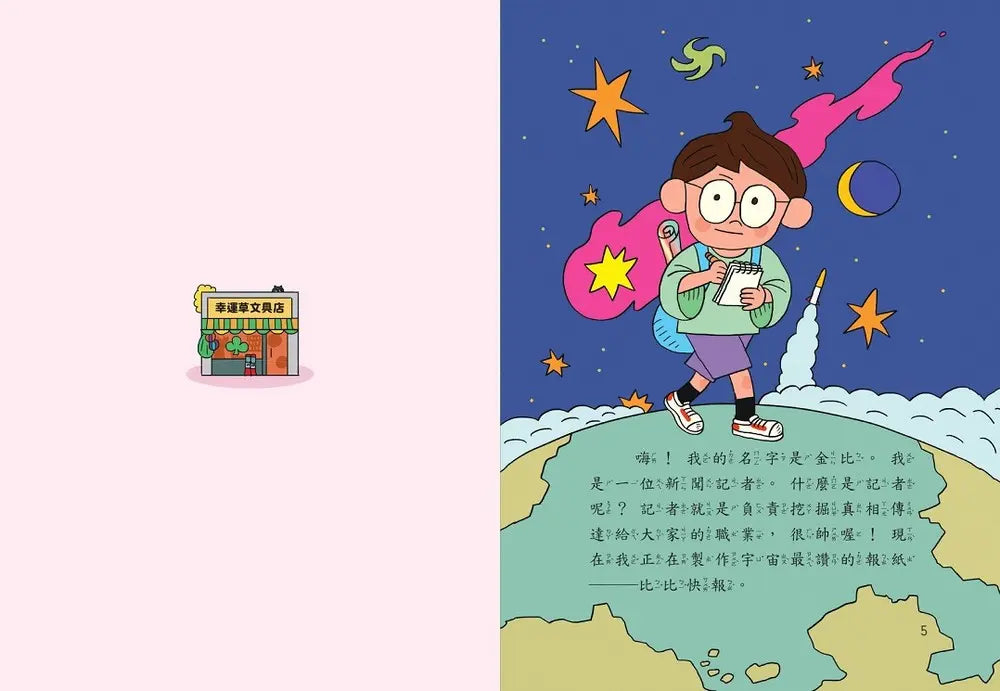 主角金比立志創辦報紙,從命名到採訪過程都充滿了天真、無厘頭的笑點,讓孩子們在捧腹大笑中享受閱讀樂趣。