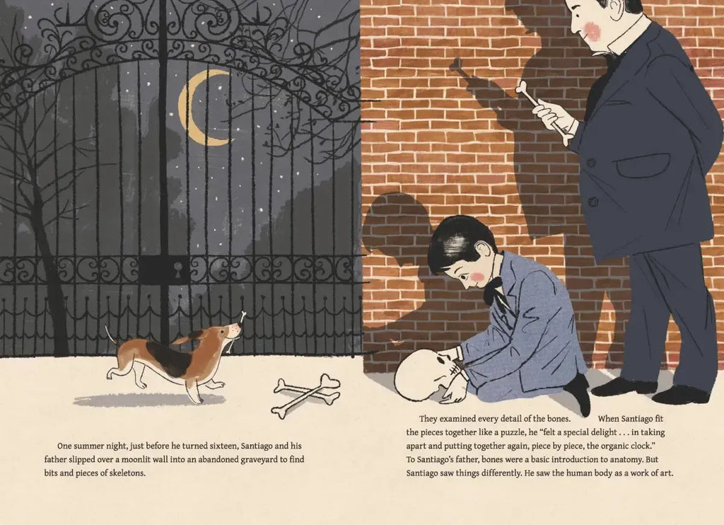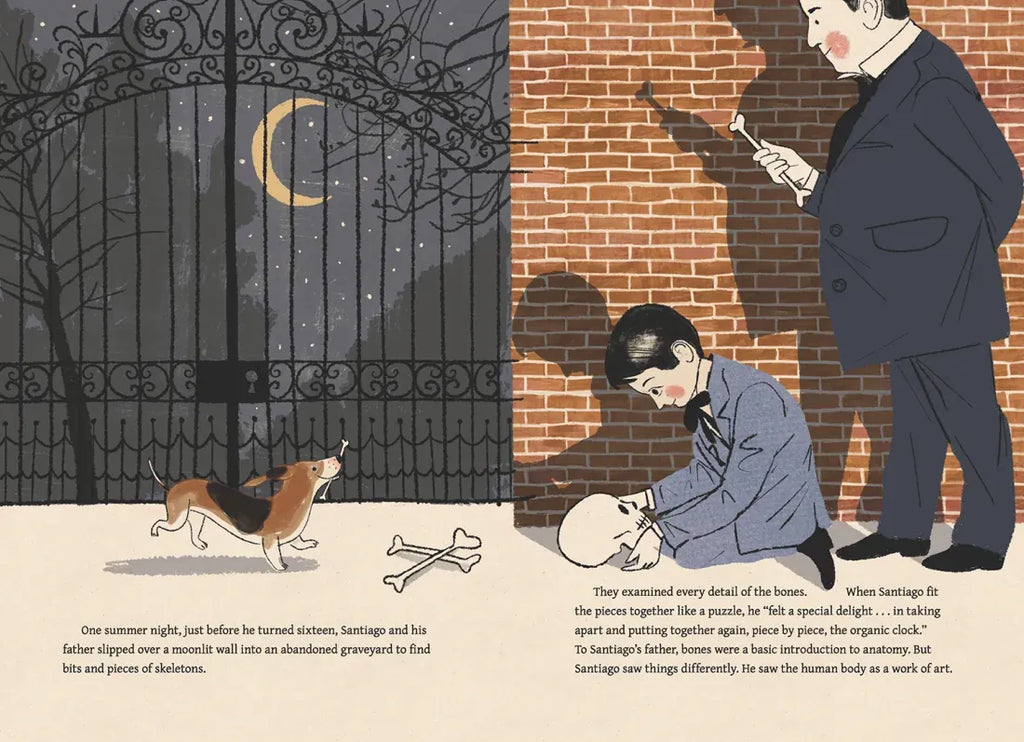Santiago always loved drawing. With chalk or charcoal, he could create bullfights on walls, and sail ships across doorways. But his father wanted Santiago to be a doctor, not an artist, so Santiago had to paint in secret. Until, one night, he and his father slipped into an abandoned graveyard to look for skeletons, and Santiago realised that the human body was a work of art too. Inspired, Santiago trained as a doctor and, with his artistic eye, he discovered the secrets of the nervous system, becoming the Father of Neuroscience.