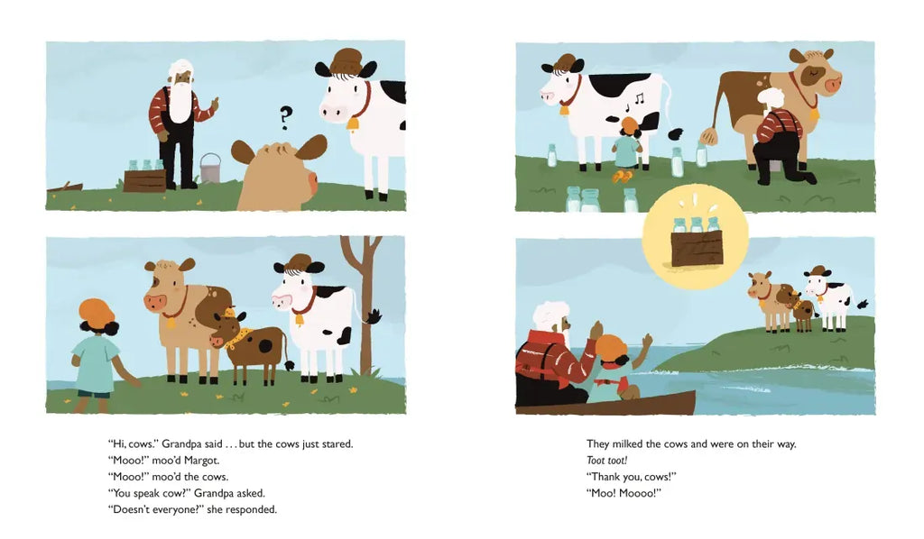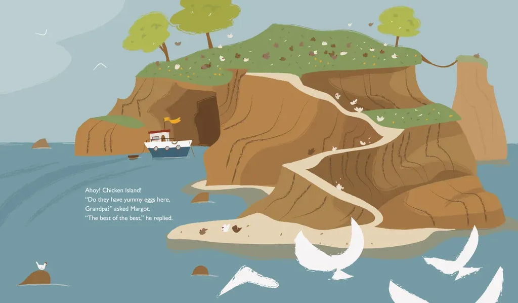 Margot and her grandpa have tummies grumbly for pancakes. Only there’s a problem . . . there’s no flour, milk, or eggs! But Grandpa has the perfect solution; they’ll get on his boat the Beluga Blue and go to Chicken Island, Cow Island, and Flour Mill Island to get the ingredients. Set sail for pancakes!