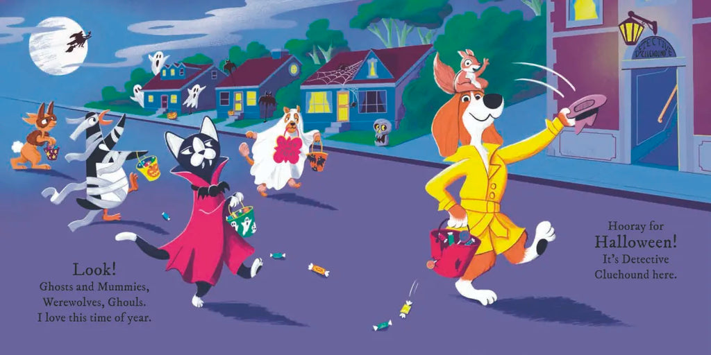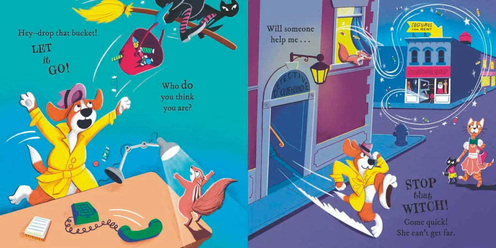 It's Halloween, and Dog Detective Cluehound and Sergeant Squirrel are enjoying their candy after a night of trick-or-treating. But when they turn their backs for a moment, a cackling someone swoops in and steals their bucket of treats!