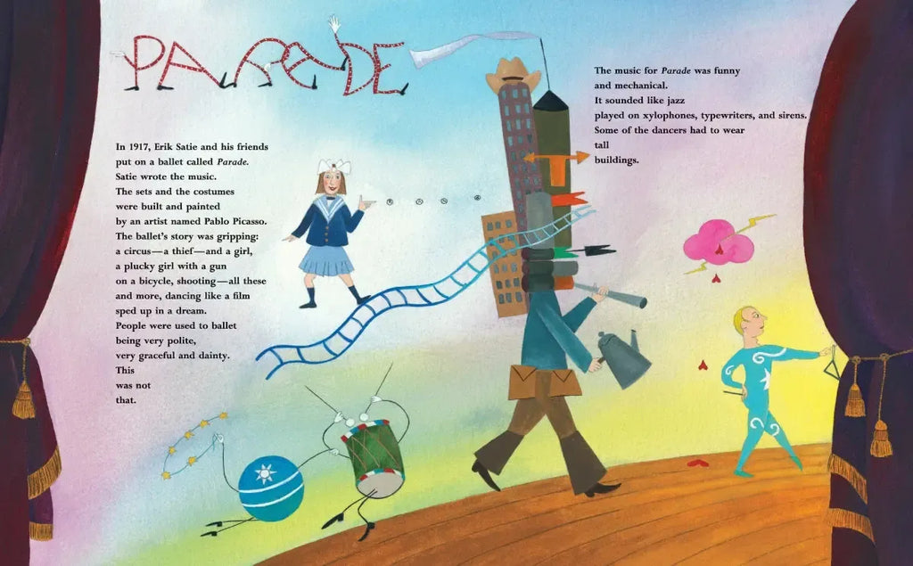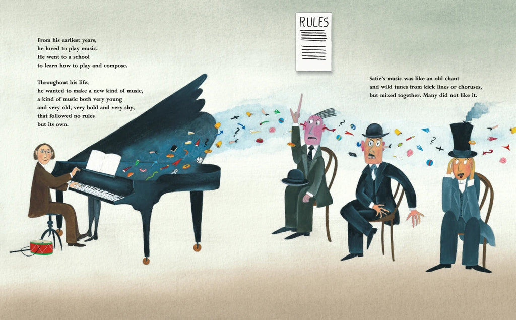 At first glance, Erik Satie looked as normal as anyone else in Paris one hundred years ago. Beyond his shy smile, however, was a mind like no other. When Satie sat down at the piano to compose or play music, his tunes were strange and dreamlike, his melodies topsy-turvy and discordant. Many people hated his music. Few understood it. But to Erik Satie there was sense in nonsense, and the vibrant, surreal compositions of this eccentric man-child would go on to influence many artists.