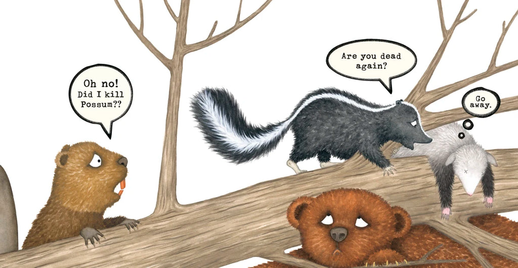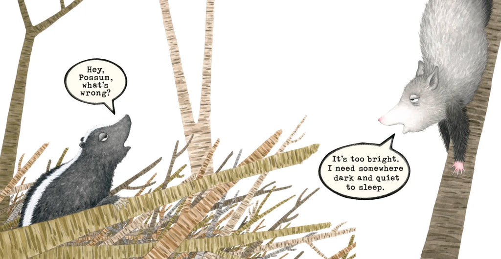 It's daytime and night animals are all sleeping soundly. Well, all except for Possum. The more places he tries to sleep, the more night animals he wakes up. Will Possum, Bear, Wolf, Beaver, and Skunk ever find a good day’s rest?