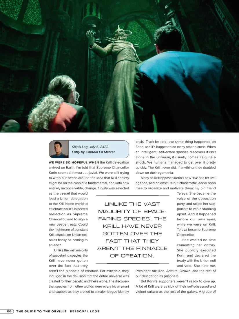 Explore exotic alien planets, adventure between innumerable stars, and get to know a diverse starship crew as they navigate their thrilling and mysterious universe. Captain Ed Mercer and his brave shipmates guide readers through the decks of the Orville, recounting their voyages through ship logs, and providing insightful commentary on the state of a changing galaxy.