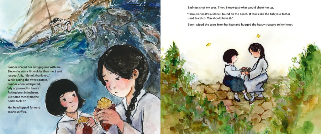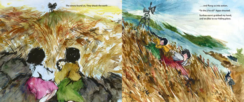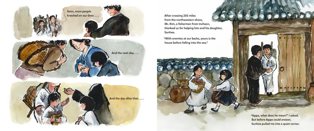 Every day, more and more people fleeing war in the north show up at Kyung Tak and her family’s house on the southeastern shore of Korea. With nowhere else to go, the Taks' home is these migrants' last chance of refuge “before falling into the sea,” and the household quickly becomes crowded, hot, and noisy. Then war sirens cry out over Kyung's city too, and her family and their guests take shelter underground. When the sirens stop, Kyung is upset—she wishes everything could go back to the way it was before: before the sirens, before strangers started coming into their home. But after an important talk with her parents, her new friend Sunhee, and Sunhee’s father, Kyung realizes something important: We’re stronger when we have each other, and the kindness we show one another in the darkest of times is a gift we’ll never regret.
