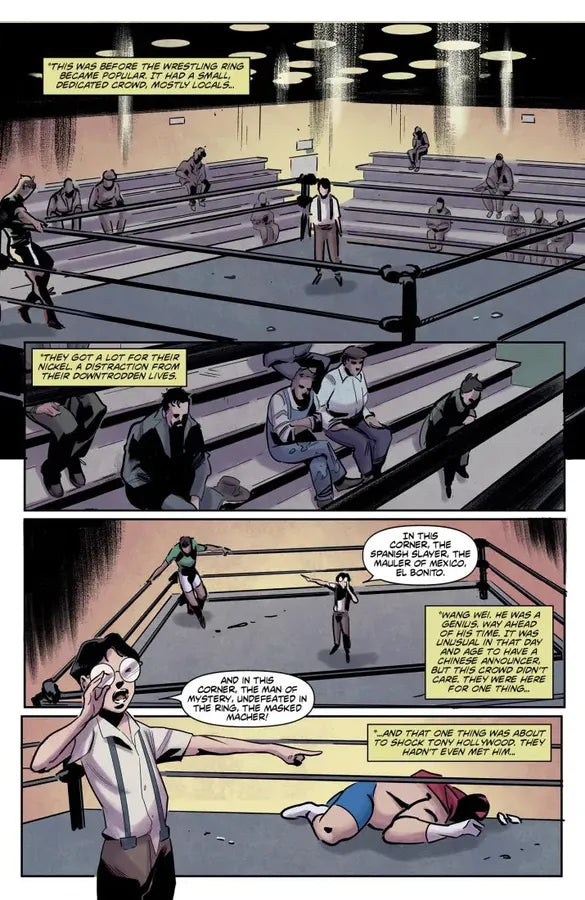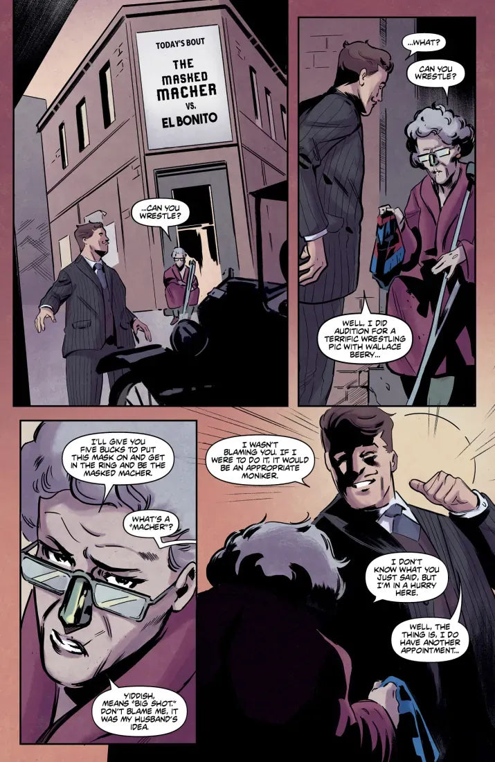 It's the 1930s and aspiring actor Tony Hollywood is about to make his big break! He’s finally got an audition for the role that will change his life, but a flat tire sends him to a different stage. Breaking down outside a wrestling arena lands him a new part to play… the Masked Macher!  Tony quickly learns there’s a lot more to this wrestling gig than meets the eye, but hey, it pays.