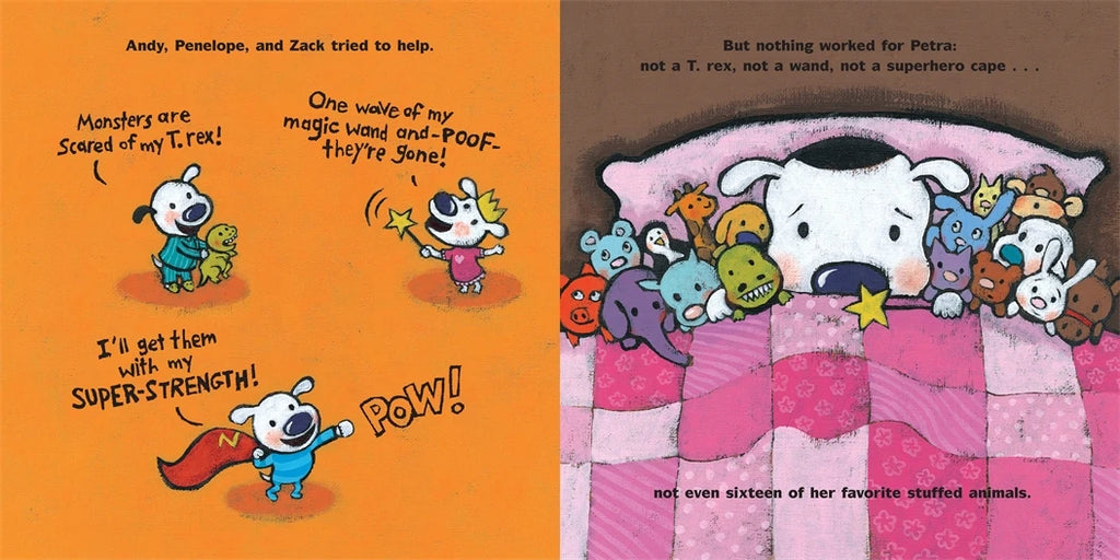 Every night, in the middle of the night, Petra wakes up. She’s afraid of the dark. She’s afraid of the noises. But most of all, she afraid of the monster. Her brothers and sister always sleep all night long, and Mama and Papa tell Petra she’ll be just fine. But Petra is still scared, so Andy, Penelope, and Zack decide to help her out. Will a T. rex scare the monster away? A magic wand? Sixteen favorite stuffed animals? What could possibly placate a hungry monster in the middle of the night?