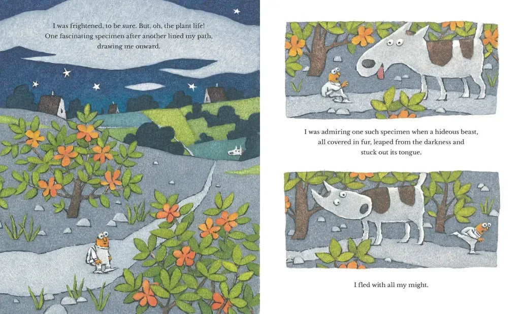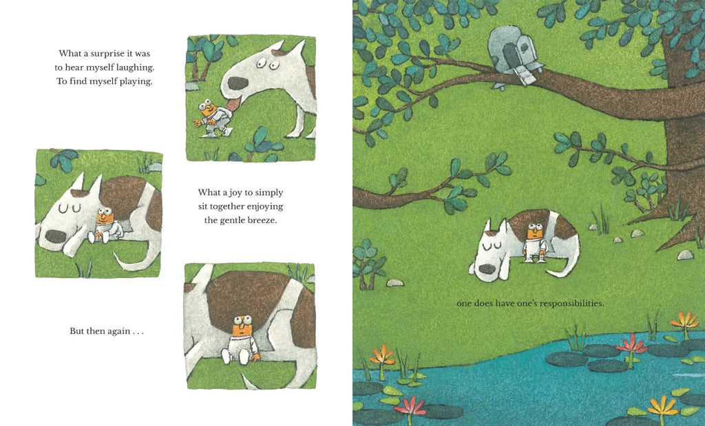 A tiny Spaceman arrives on a new planet, ready to perform his monotonous tasks – collecting samples, labelling and filing them, and moving on to the next planet. But pausing to look around, the Spaceman is dazzled by the beauty of his surroundings. Marvelling at a varied landscape of flowers, butterflies, and other wondrous creatures, he finds a pond to float in and a goofy beast who seems to want to be his friend. Could it be that the Spaceman has found a new home? With deadpan humour, this simple and sophisticated story offers surprises on each lively spread.