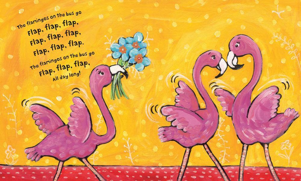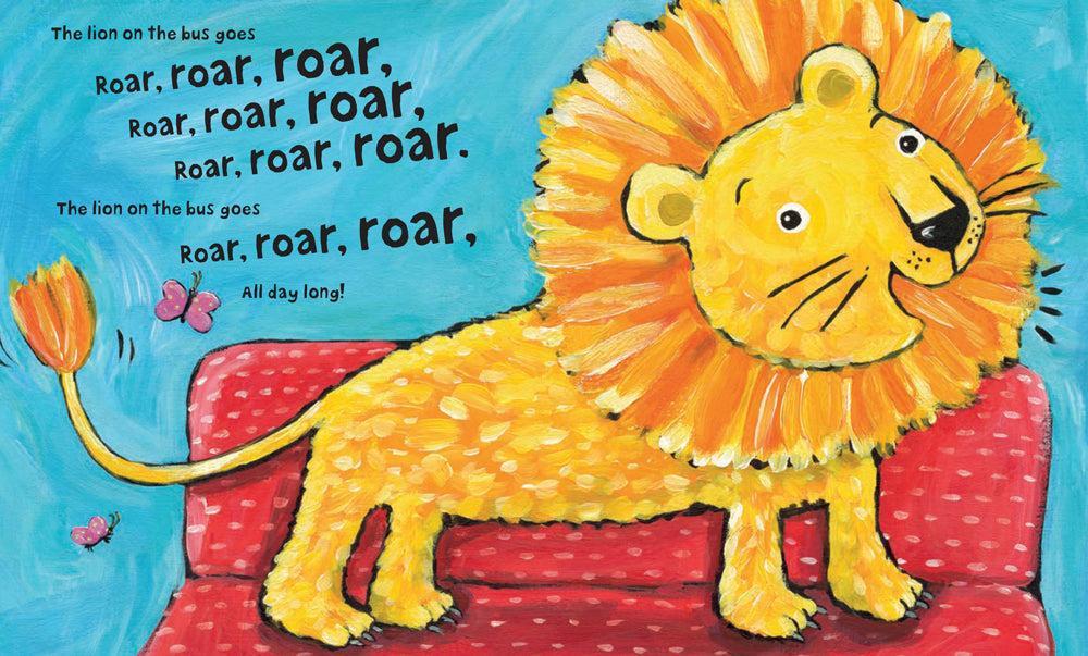 A lion roars, flamingos flap, and a hyena laughs a big ha-ho-hee as they travel on the bus with their animal friends. Don't forget to watch out for the crocodile too, whose jaws go snap! Together, a simple trip becomes a raucous adventure that young readers can sing and  move along with at any story hour, family reading time, or energy-filled morning.