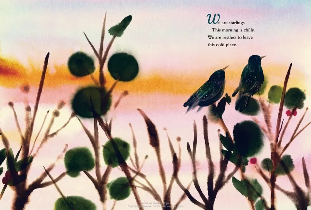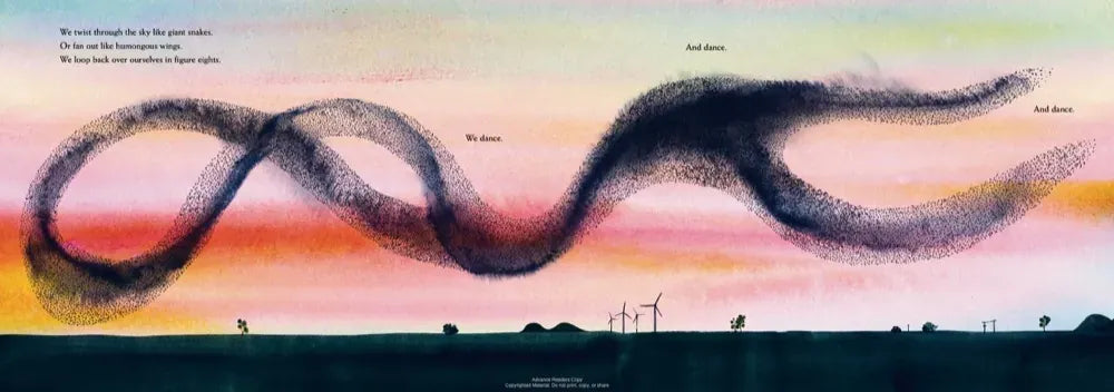 The story is told from the point of view of the flock, which gives the reader an inside look at what is happening, and the breathtaking illustrations perfectly capture the ebb and flow of a murmuration. Young readers will witness and fully appreciate the extraordinary communication and collaboration abilities of these birds and may be able to apply these lessons to their own lives.