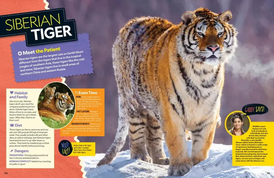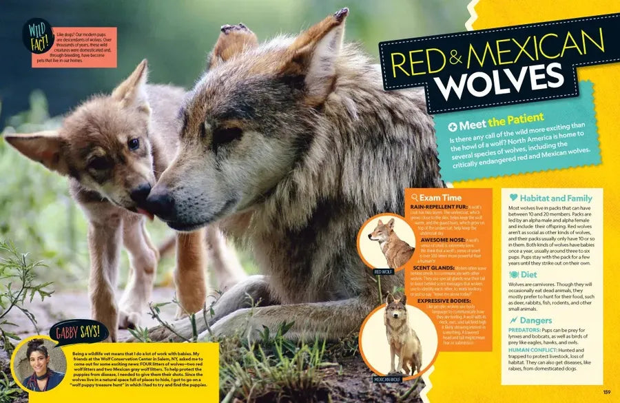 Travel the continents to meet some of Earth's most incredible critters through the eyes of a windblown, adventurous wildlife veterinarian. Join Dr. Gabby Wild as she performs dental work on a jaguar, teaches a baby bird to fend for itself, and gives a chimp a checkup. Learn about animal anatomy and behaviors, diets, families, and the dangers they face in the wild. Get up close--and we do mean CLOSE--to more than 80 animals that are both familiar and not so familiar, including regal lions, playful pandas, fearsome Gila monters, and creepy tarantulas. Examine world maps to learn about amphibians, wild cats, and primates across the globe. Read about some special human-animal relationships as well as challenges that arise when they share a habitat. Then learn how people are working to save and protect endangered species. And for your final thrill, find out how YOU can become a wildlife vet, too!