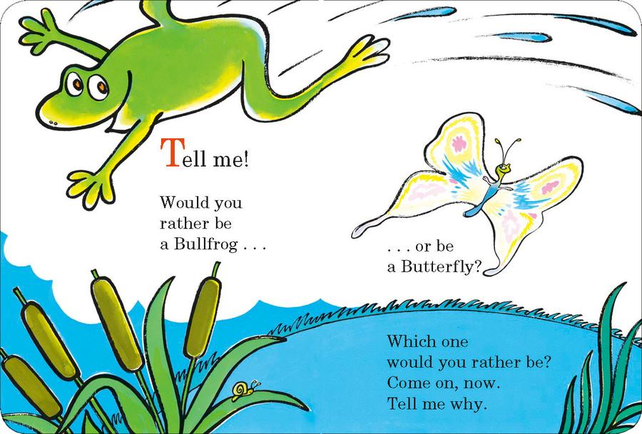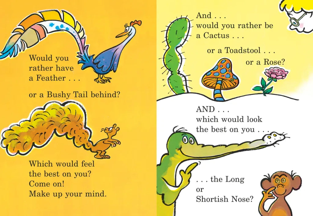 Would you rather be a clarinet . . . a trombone . . . or a drum? (How would you like to have someone going boom-boom on your tum?) Beginning readers are asked to ponder these–and a host of other odd choices–in this charming, provocative book by Dr. Seuss that encourages children to let their imaginations fly.