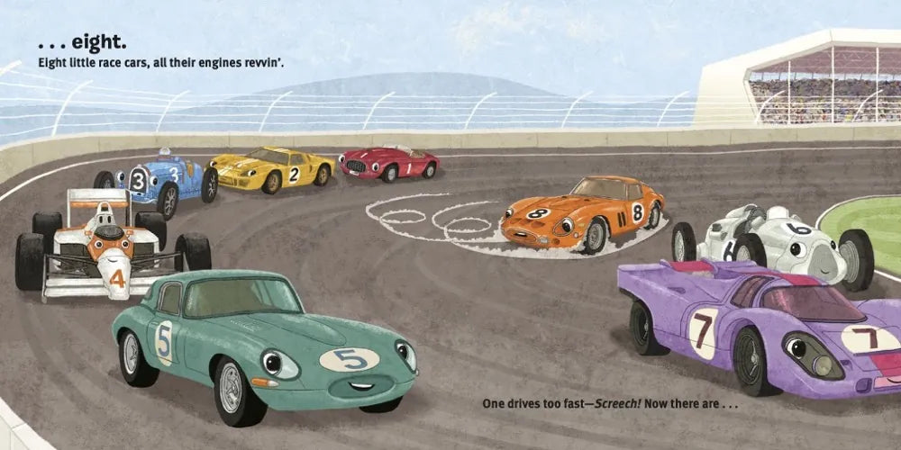 It's the car race of the century! On each page of this action-packed board book, young readers can count down race cars from ten to one. Along the way, motorsport fans will spot cars inspired by some of the legends of the history of racing, including the Porsche 917, Lancia Stratos, McLaren MP4/4, and Bugatti Type 35. With noisy words on every page, this is the perfect book to read aloud with your little race car fan.