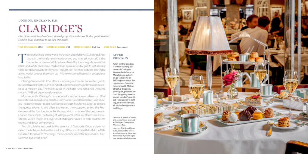 From The Peninsula Hong Kong to Lake Como’s Grand Hotel Tremezzo, Marrakech's La Mamounia to London’s Claridge’s, this beautifully illustrated collection unveils the grand histories, one-of-a-kind experiences, and lush hideaways of 100 of the world’s most remarkable hotels.