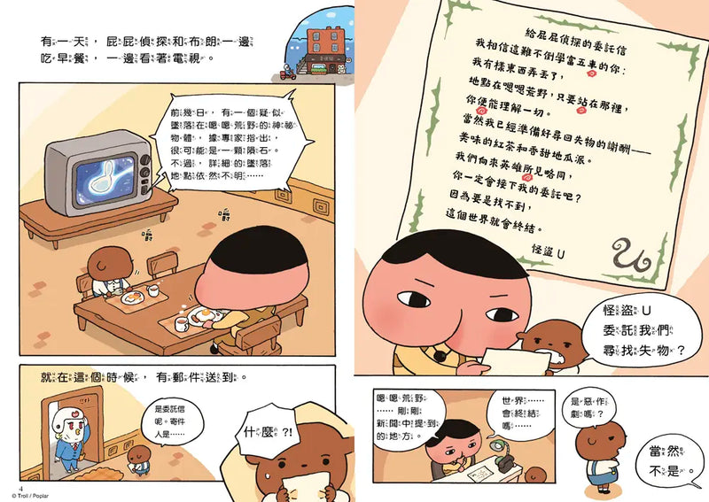 某天,屁屁偵探事務所收到一封委託信,寄件人居然是怪盜U,他請屁屁偵探去「嗯嗯荒野」尋找一件失物,還說如果屁屁偵探完成任務,他會準備美味的紅茶與香甜的地瓜派加以款待(怪盜U果然非常懂得投「老對手」所好)。問題是:信上從頭到尾都沒說所謂的「失物」究竟是什麼,而且還有一段充滿可疑氣味的謎樣結語:「要是找不到,這個世界就會終結」?!