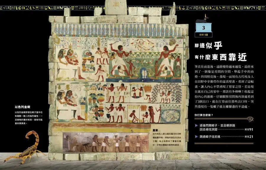 邊看故事邊解謎!你需要在130個選擇中做出正確的決定,才能成功逃出地下墓室!豐富的古埃及文物典故圖文將是你找尋生存線索的關鍵之一!當危險來襲,你需要臨危不亂冷靜面對,因為只有智慧的人才能看見出口的光亮!