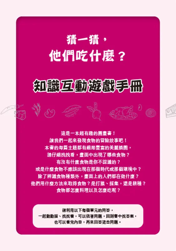 繁體中文版獨家設計10個單元的親子共讀QA益智問答,透過問題引導小朋友猜猜看、想想看,並練習找答案,培養觀察力與激起好奇心,從遊戲中認識食物與有趣的飲食文化。