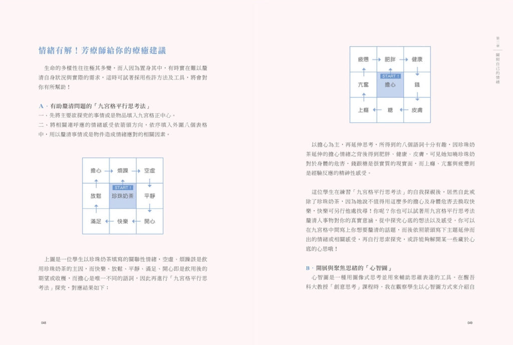 所有的情緒,大多源自於「失衡」的關係,芳療師先以「九宮格平行思考法」為你釐清情緒關聯與對應;再以「心智圖」開拓思緒、將錯綜混亂的情緒化繁為簡;最後運用「植物香氣」給予療癒、支持與跨越的力量,漸進式引導你從自己的情緒透析看見關係的扭曲,進而從關係的扭曲發掘自己的缺乏,唯有找到情緒痛點的所在之處與不滿足,累積已久的身心窒礙才有解。