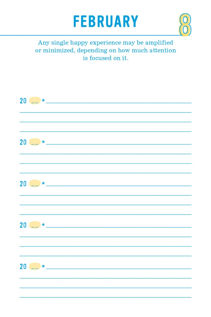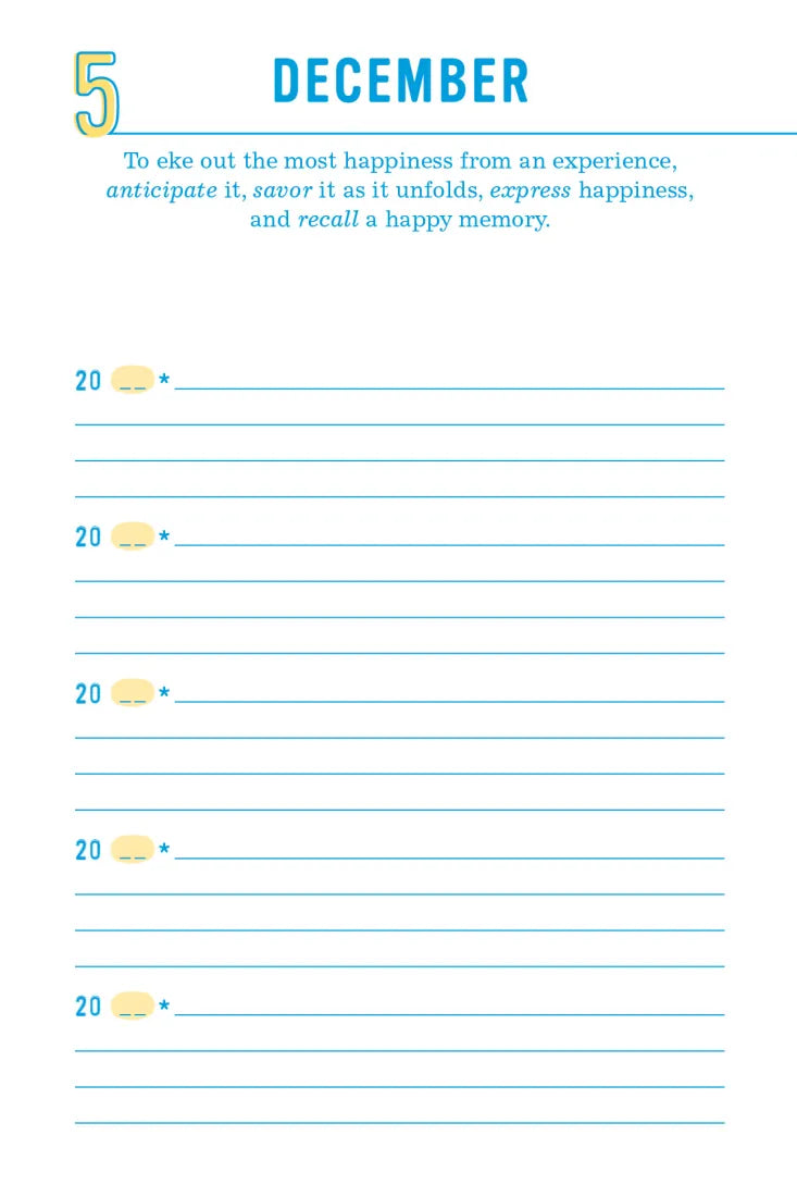 In her bestselling book The Happiness Project, Gretchen Rubin discovers the pleasure of writing just one sentence every day. The Happiness Project One-Sentence Journal helps you to make a fascinating and revealing time capsule of the next five years of your life. Simply turn to today’s date, reflect on the quote at the top of the page, and jot down just one sentence (perhaps about something good that happened that day).