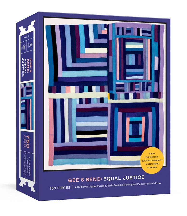 An extraordinary 750-piece puzzle that portrays an intricate, geometric-patterned quilt in mesmerizing shades of teal, lavender, pink, and royal blue stitched by Essie Bendolph Pettway, a member of the historic Gee's Bend quilting community, and published by Paulson Fontaine Press in Berkeley, California.