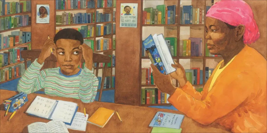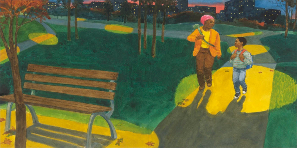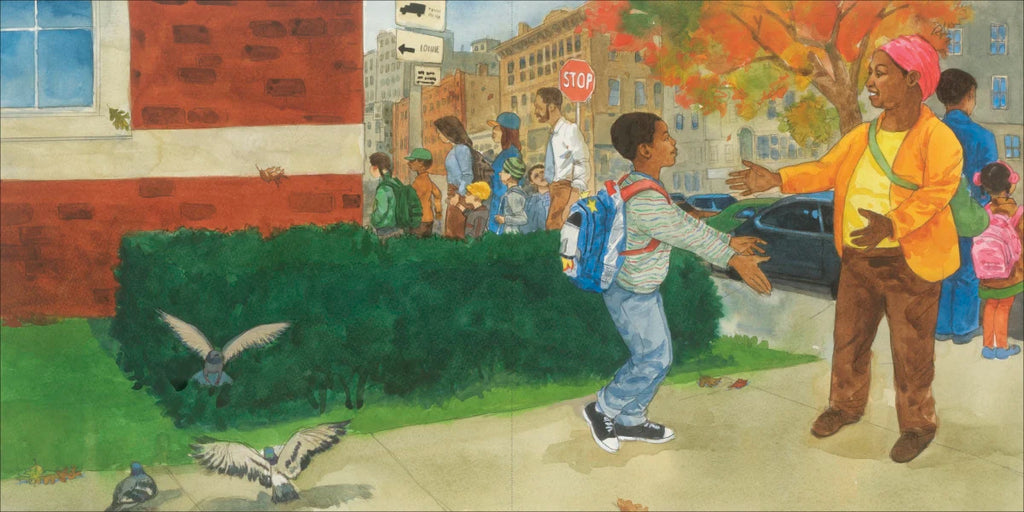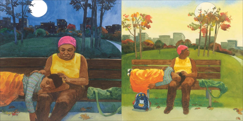 When a little boy's mom picks him up from school, his day seems a lot like any other kid's. He and his mom go out for some fast food and then head to the library. But when they stay there till closing time, and then go to the park, we learn more. Through the lens of Ransome’s evocative illustrations we see that they ate out because they don't have a kitchen to cook in. They went to the library because they don't have a quiet space to do homework. And at night, they settle in to sleep on a bench in a city park because they don't have a home. The next morning, they are awakened by the rising sun, Mom’s bag is full of clean clothes, and there’s a fountain for washing up--and finally they are ready for the walk to school. His classmates may or may not know about his living situation, but what shines throughout the story is the deep love he and his mom have for each other.