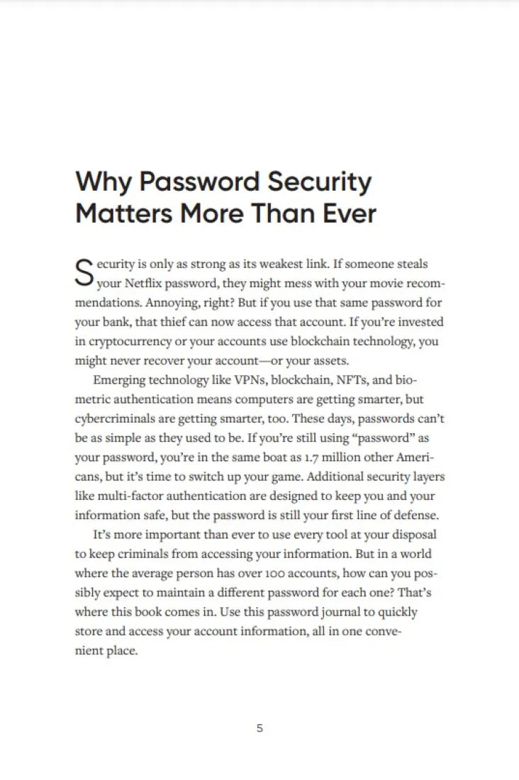 - Large trim size for extra space to record over 400 accounts, including important notes, password changes, and non-traditional records such as crypto logins.