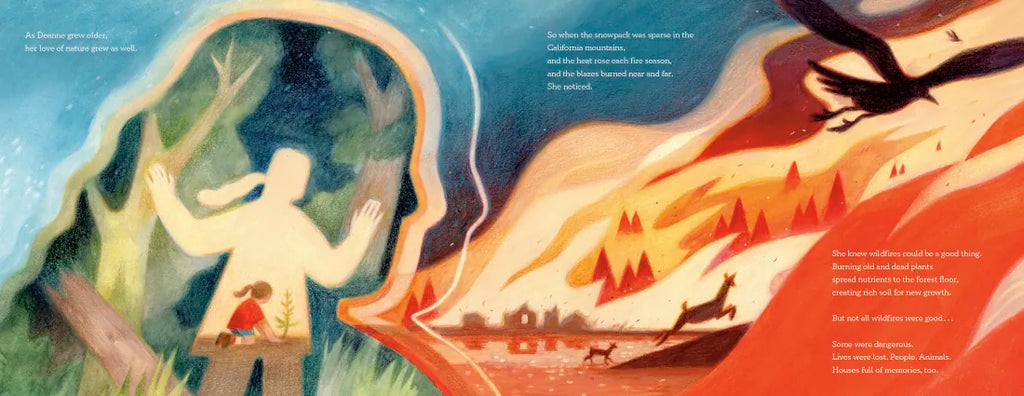 With lyrical text from Jessica Lawson and striking illustrations from Sarah Gonzales, Ablaze tells the story of Deanne Shulman’s groundbreaking work with the United States Forest Service as she fought against unfair rules and blazed the way for women in firefighting.