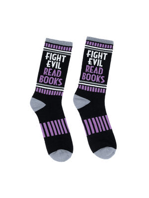 "Fight Evil, Read Books." These athletic gym socks are brought to you in partnership with Pantheon Books.