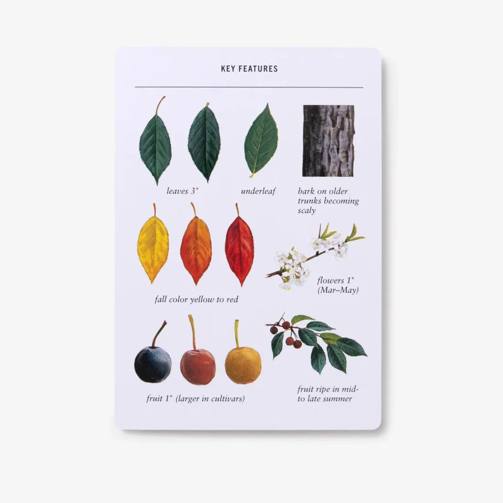 • precise illustrations showing the tree’s bark, leaves, twigs, buds, fruit, and flowers