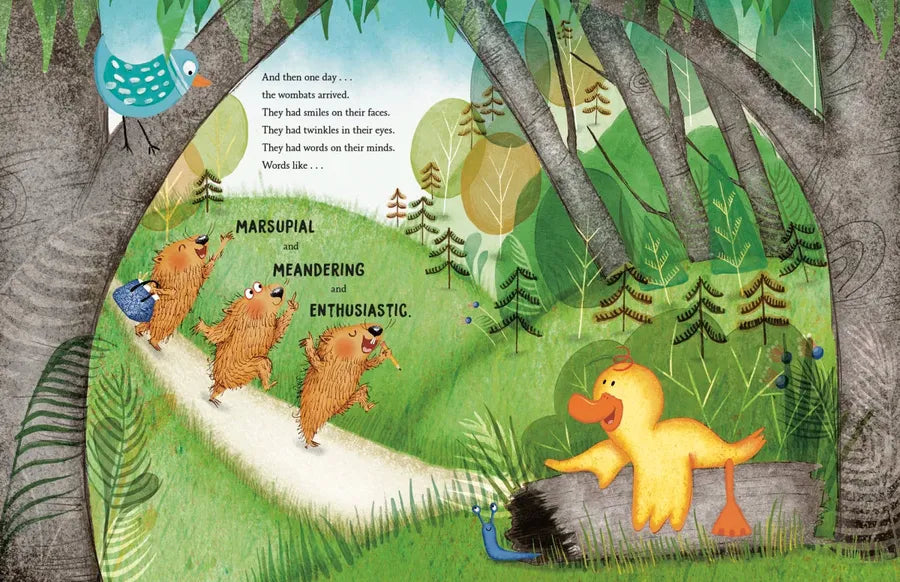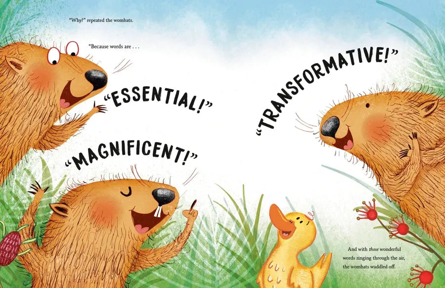 A trio of wandering wombats with a passion for words inspire an enthusiastic duckling to transform her town from dull to dazzling in this delectable picture book that shares with children the magic of words.