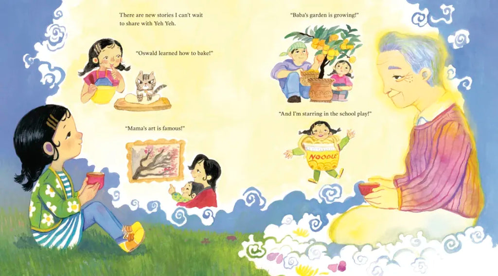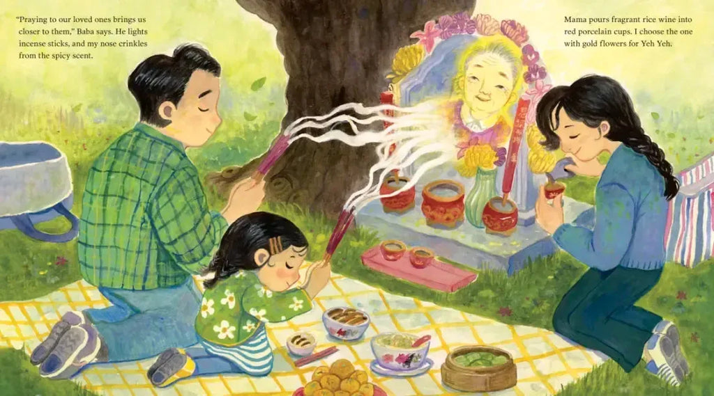 As the family sweeps and clears debris from Yeh Yeh’s grave, burn incense and joss paper, the little girl has an offering of her own. She shares about her adventures and accomplishments from the past year, burning a drawing of a bicycle, so that Yeh Yeh can ride like they used to at the park. With every story and offering, she feels closer to her grandfather. When the family gathers for a picnic at the grave, indulging in Yeh Yeh’s favorite foods—it is a tender moment of togetherness.