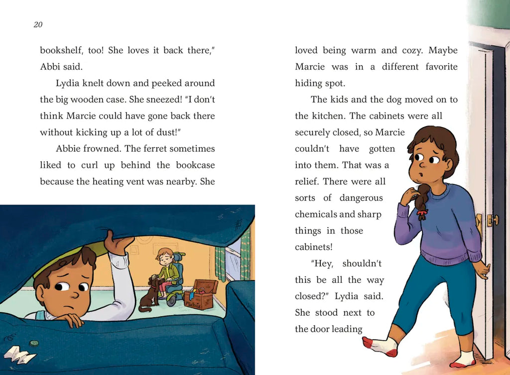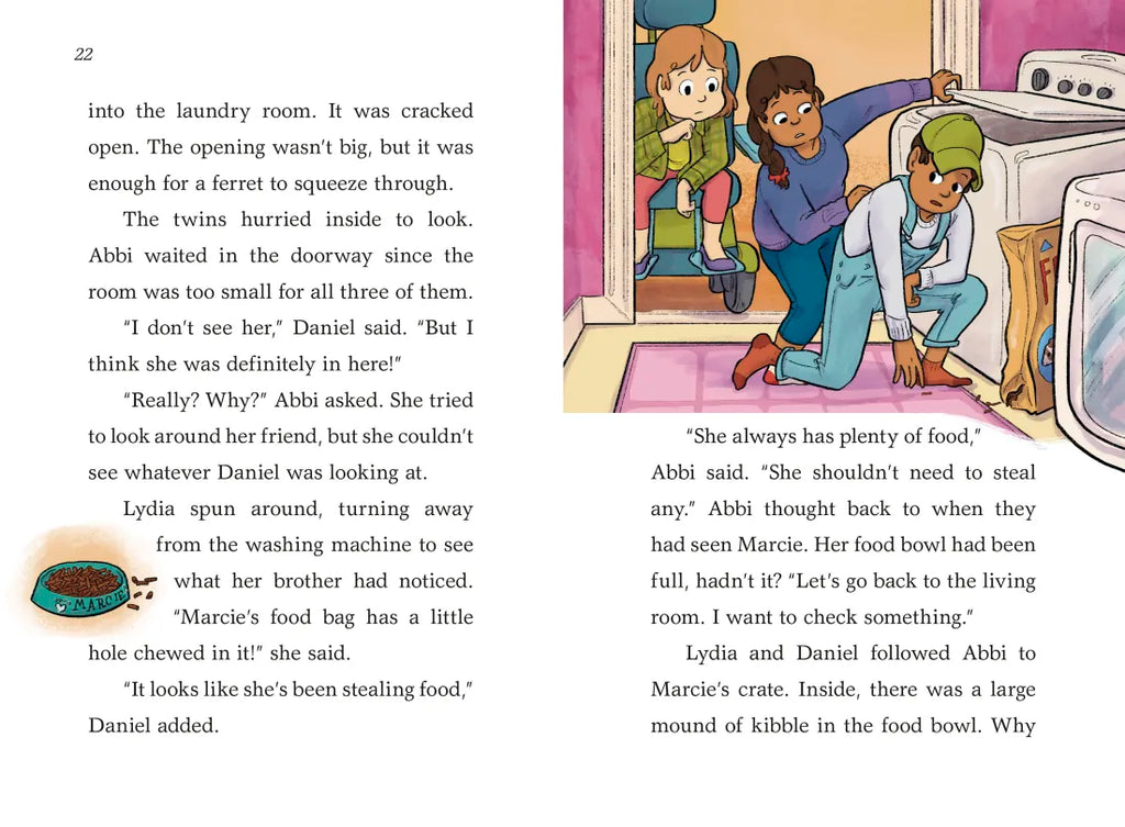 Follow that ferret! Abbi and her friends and family are pet-sitting at a petting zoo and animal sanctuary. The kids are in charge of the ferret, Marcie. There's just one problem: Marcie is acting very strange. She seems upset! Then she runs off, escaping her crate, and sending Abbi, Lydia, and Daniel on a hunt for the missing ferret! Little do they know that finding Marcie will lead to an even bigger mystery. . . .