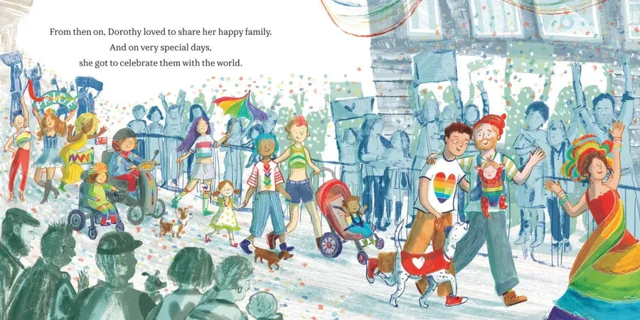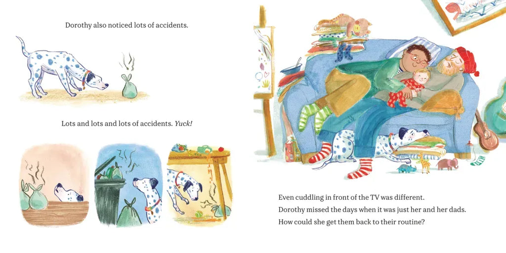 But everything changes when her dads bring home a new addition—a noisy, floppy, screechy, smelly baby! Dorothy's world is turned upside down as the family's routine is thrown into chaos. No more long walks, no more relaxing baths, and mealtimes become a whirlwind of activity.