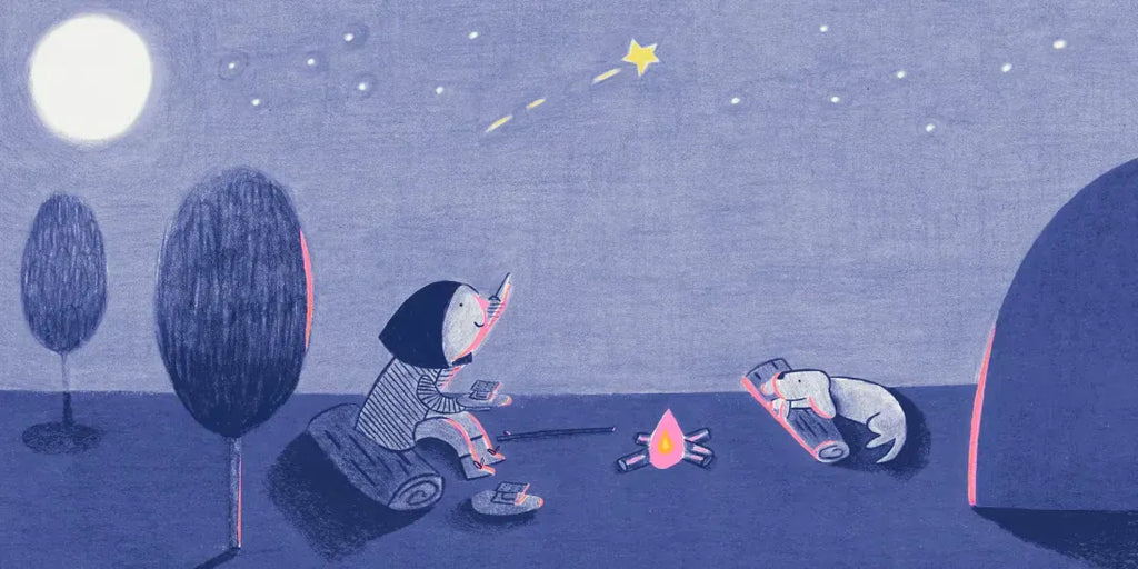 In this wordless story, a girl and her dog enjoy a camping adventure: flying their kite, swimming in the lake, and making s'mores by the fire. But when night falls, they hear a sudden and loud CRACK break through the dark silence. As the eerie sounds continue and a shadow starts to grow outside their tent, they decide to take a look… What could it be? There's only one way to find out in this visual, heartwarming story from artist María Coco that's enriched with incredible suspense and charm that transcends words.