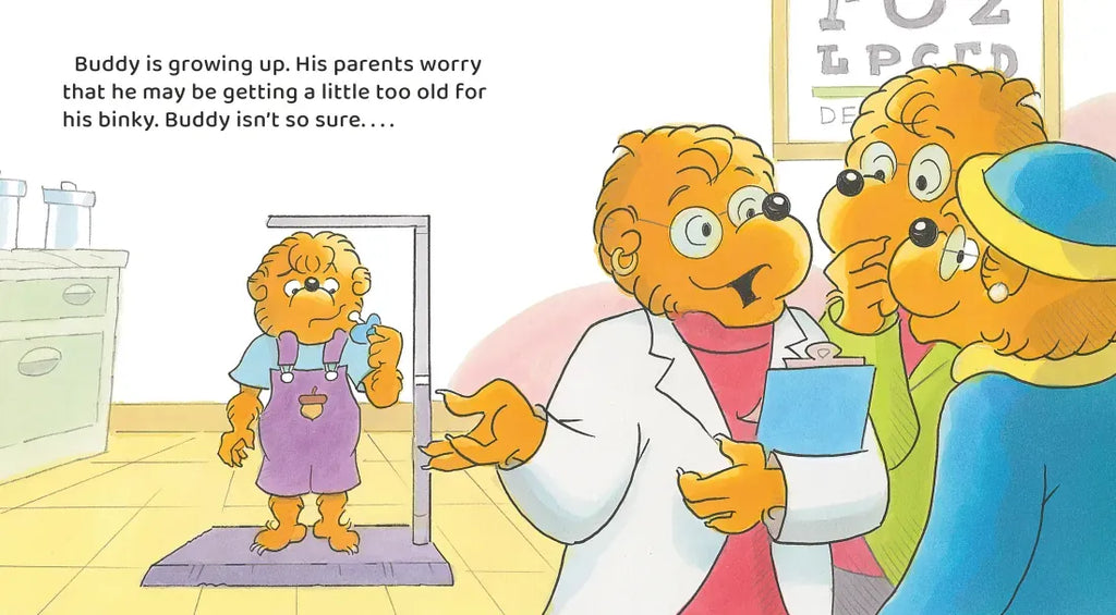 Buddy loves his pacifier and takes it everywhere. But as he starts to notice that other cubs don’t use binkies anymore, his parents help him take the next big step! With adorable illustrations and gentle humor, this Berenstain Bears "growing-up" book is the perfect way to help your little cub let go of their pacifier!