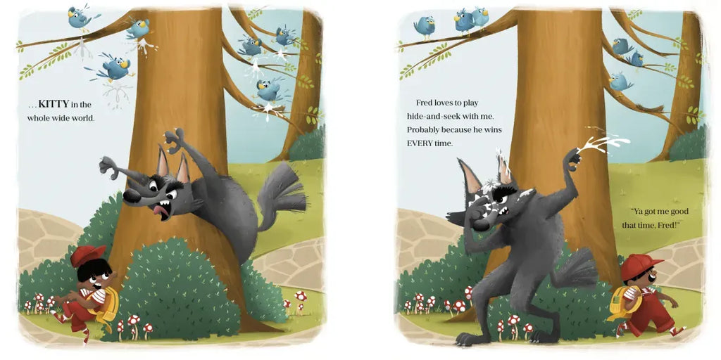 Once upon a time. . . . Little Red loves to visit his great-grandfather. He makes the trip through the woods any time of year! The best part is when Little Red meets Fred along the way. Fred is the bestest, fluffiest,  most amazing KITTY in the whole wide world (nevermind that Little Red is completely oblivious to the fact that Fred is, in fact, a very hungry wolf that is trying to EAT HIM). When Fred gets hurt (from a trap HE set for Little Red), Little Red takes his injured friend to Great Grandfather's house. That's when Great Grandfather tells Little Red that Fred is actually ... a DOG?! EVEN BETTER. (Poor Fred.)