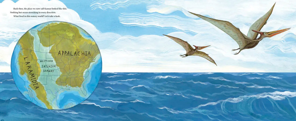 Once upon a time, 85 million years ago, the middle of America was submerged in water--and incredible creatures roamed the sea. On a typical afternoon, a small herd of Claosaurus munches on plants along the shoreline. Above them, a Pteranodon glides across the sky in search of fish... when, suddenly, a Squalicorax grabs a young dinosaur with its bone-crunching bite. Chomp!